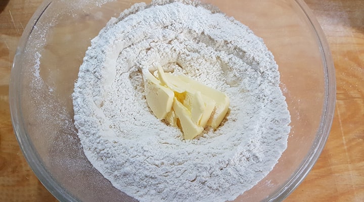 Après les palabras, il faut venir aux faits. J’ai donc commencé en tamisant dans un bol de la farine T45, à laquelle j’ai ajouté du beurre, pour le malaxer à froid (les comtes Cabrera auraient voulu du saindoux, mais les temps changent…).