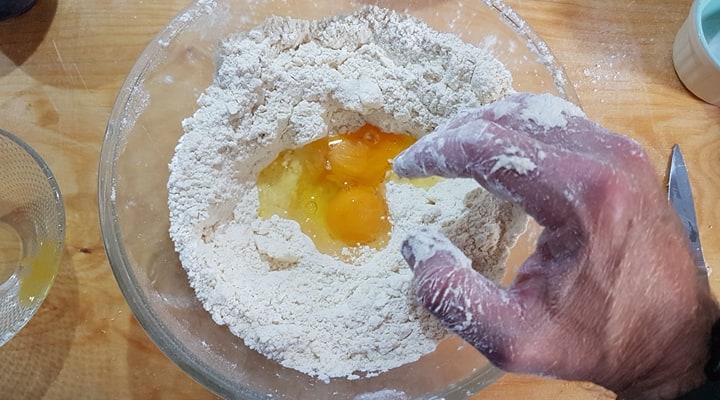 Ingrédients pour 24 mpanatigghi (4/6 personnes) : pour la pâte = 500 g. de farine T45, un oeuf entier, un jaune d’oeuf, 180 g. de beurre, 70 cl de Marsala Fine, 3 g. de sel et 3 g. de bicarbonate alimentaire. Pour la farce = 200 g. de farine d’amandes, 200 g. de viande hachée de veau, 150 g. de chocolat noir de Modica, 60 gr de sucre de canne, deux clous de girofle, une bonne pincée de cannelle.