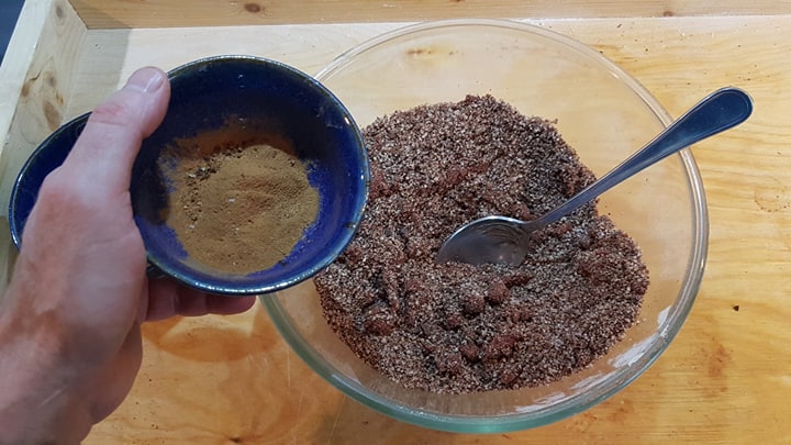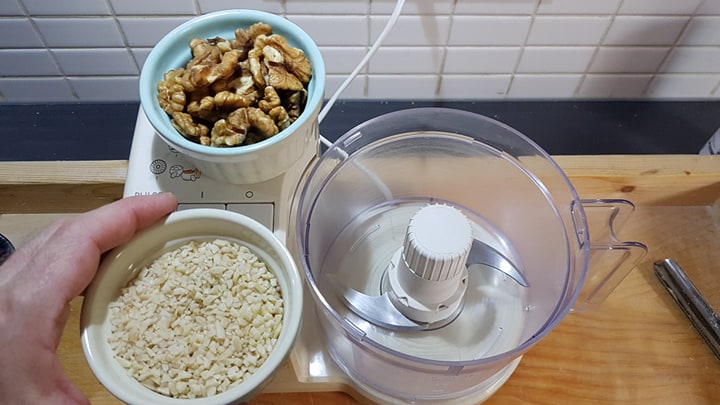 Passons aux ingrédients de la farce. Tout d’abord, il faut mélanger de la farine d’amandes (autre fleuron de la cuisine sicilienne) avec des cerneaux de noix et quelques clous de girofle (le tout émietté dans le robot mixeur)…