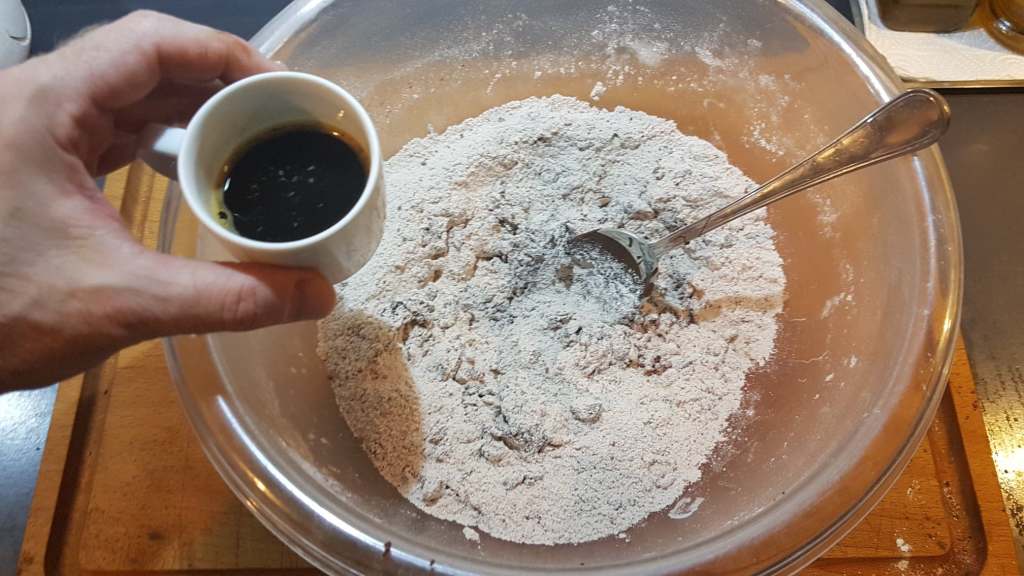 Farine blanche T45 = 300 g., sucre = 200 g. (150 + 50), chocolat noir fondant au moins 70 % = 100 g., une cueillère de cacao amer en poudre, une cuillère de cannelle en poudre, une cuillère de clous de girofle moulus, trois tasses de café espresso à l’italienne, une pincée de sel, une cuillère de bicarbonate alimentaire (ou de levure chimique), huile extra vierge, un bol de eau de fleurs d’oranger amer.