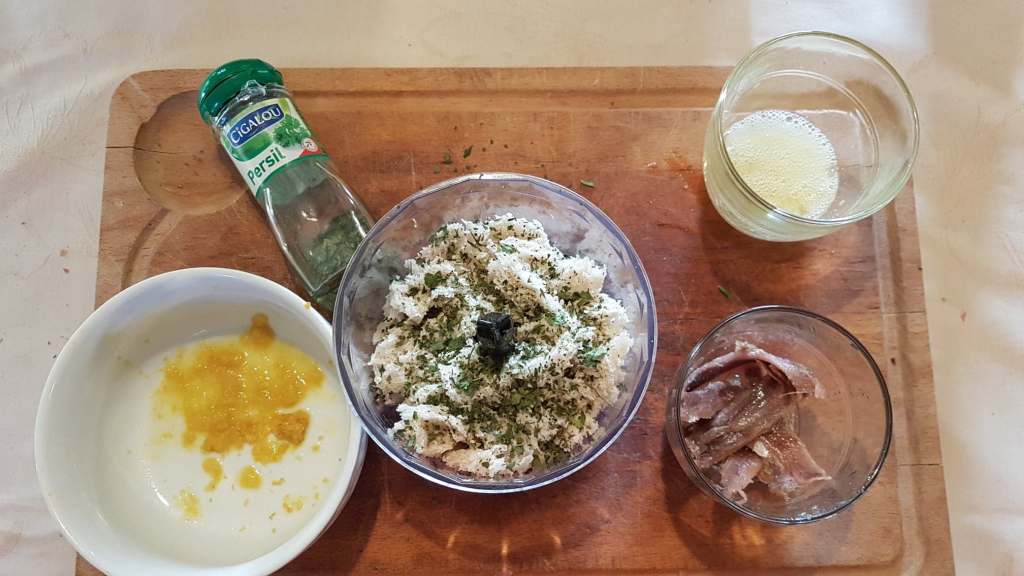 Il convient d’abord de préparer la farce avec de la mie de pain, du persil, des filets d’anchois, la peau d’un citron râpé et un blanc d’oeuf. Il faut d’abord émincer dans le robot mixeur la mie avec les filets et le persil.