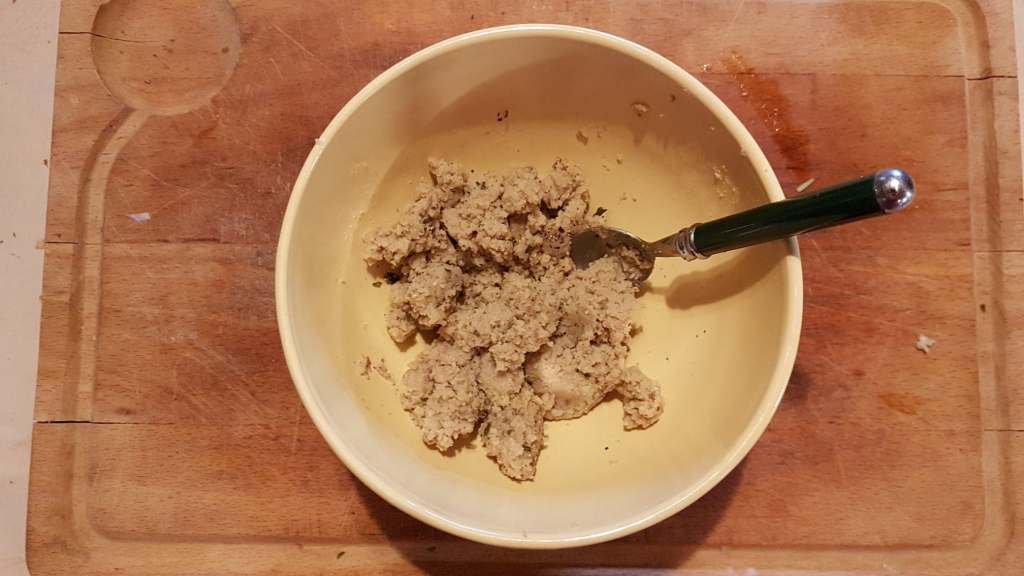 … puis continuer dans un bol en ajoutant les zestes râpés, le blanc d’oeuf légèrement battu, du sel et du poivre.