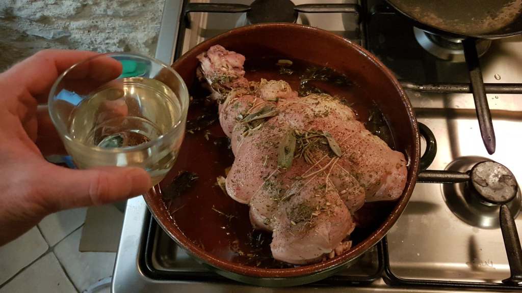 Quant à l’extérieur de la viande, il devra être badigeonné, salé et poivré. Puis posé dans un plat à four, avec quelques gousse d’ail et des aromates : sauge, thym, romarin, tout ce qu’on peut trouver dans la garrigue.