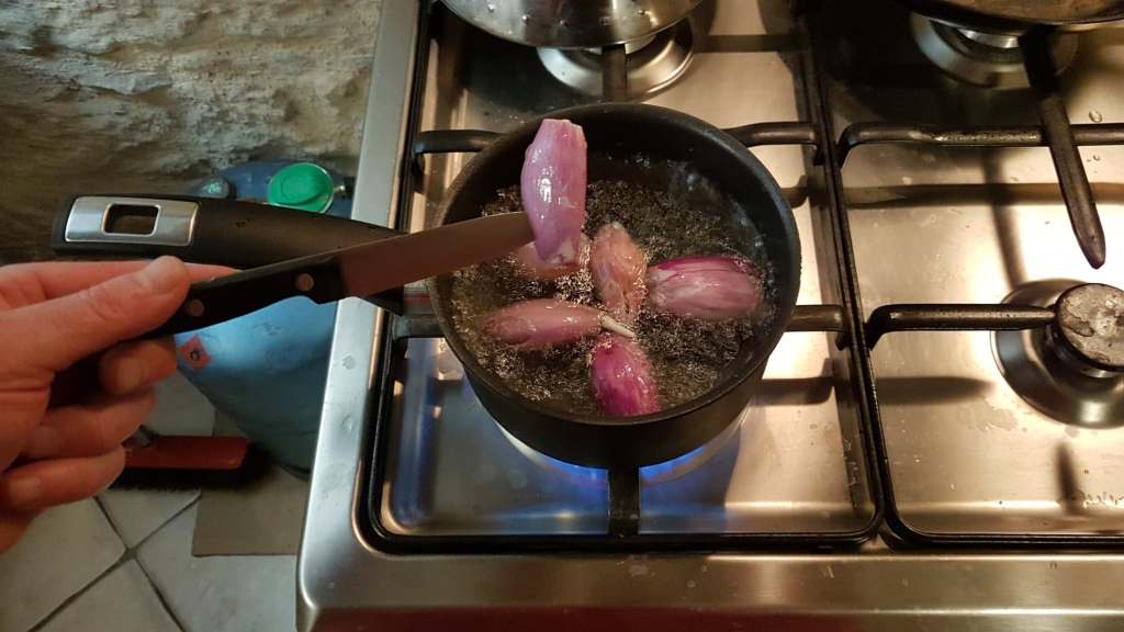 Entre temps… on s’occupera de la garniture. Il faut éplucher des échalotes, et le faire bouillir dans de l’eau salée pendant cinq minutes.
