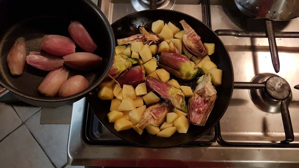 J’ai aussi fait sauter à la poêle des pommes de terre et des artichauts, et ajouté par la suite les échalotes, avec du sel, du poivre, un filet d’huile d’olive et un peu de jus de citron. Et si vous avez des tomates séchées, surtout ne vous gênez pas.