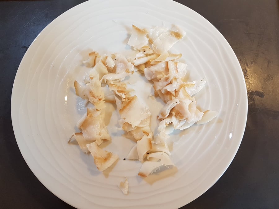 D’abord chaque morceau doit être réduit en miettes (les bruscitt’) d’environ deux centimètres d’épaisseur.