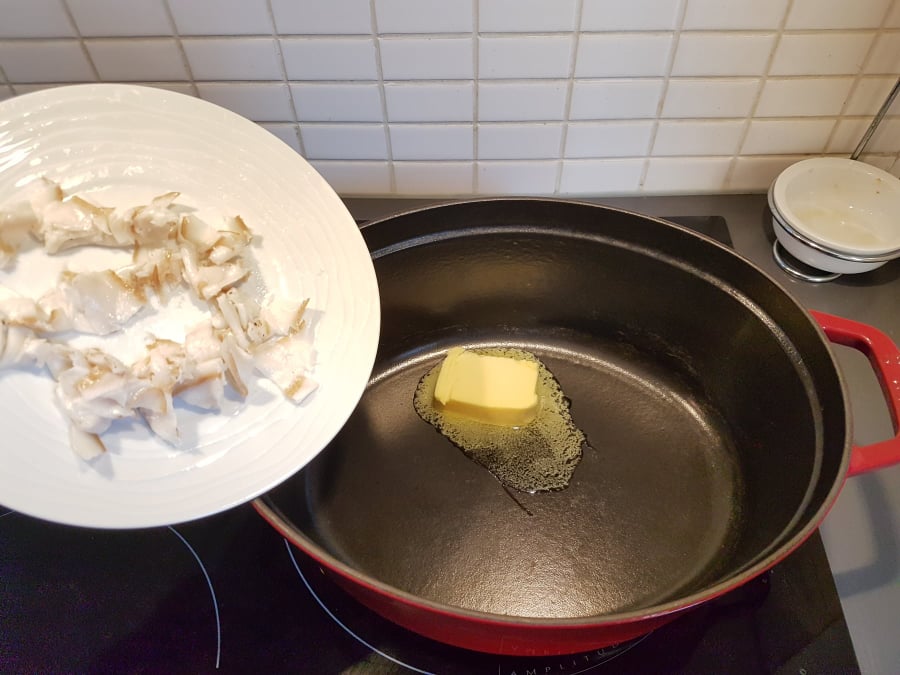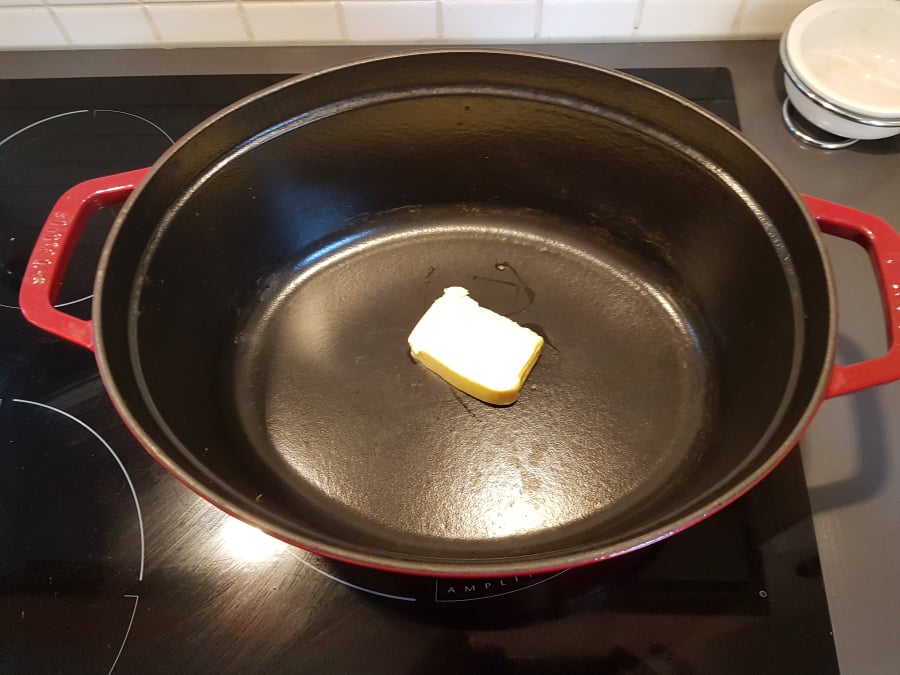 Et c’est parti ! Dans une casserole en fonte, laissez fondre à feu doux une noix de beurre…