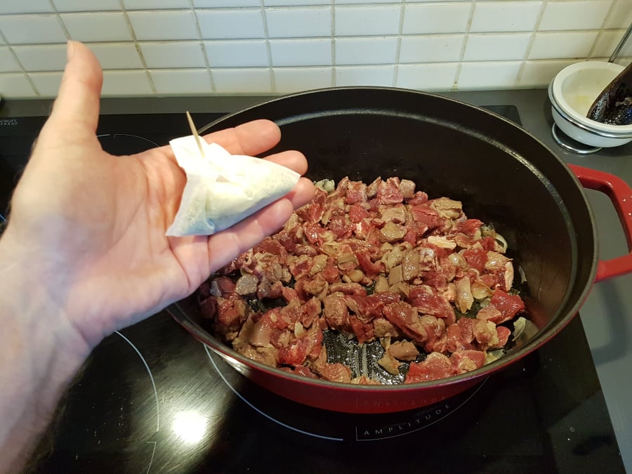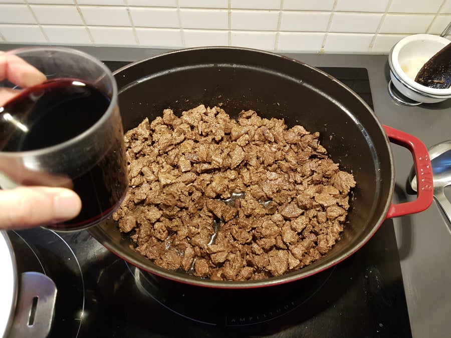 A present enlevez la gaze avec les aromates et versez un verre de rouge corsé. Laissez évaporer complètement à feu très doux (au moins un quart d’heure).