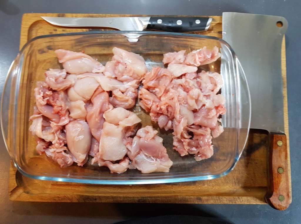 Il faut d’abord couper la bête en morceaux, pour ensuite les écorcher. Sur la gauche (de la photo), j’ai mis le grosses tranches (qui serviront pour les brochettes). Sur la droite j’ai posé le restes, avec ou sans os. Ces derniers iront cuire dans un bouillon de viande. Ils serviront pour une petite sauce à utiliser sur des pâtes le lendemain…