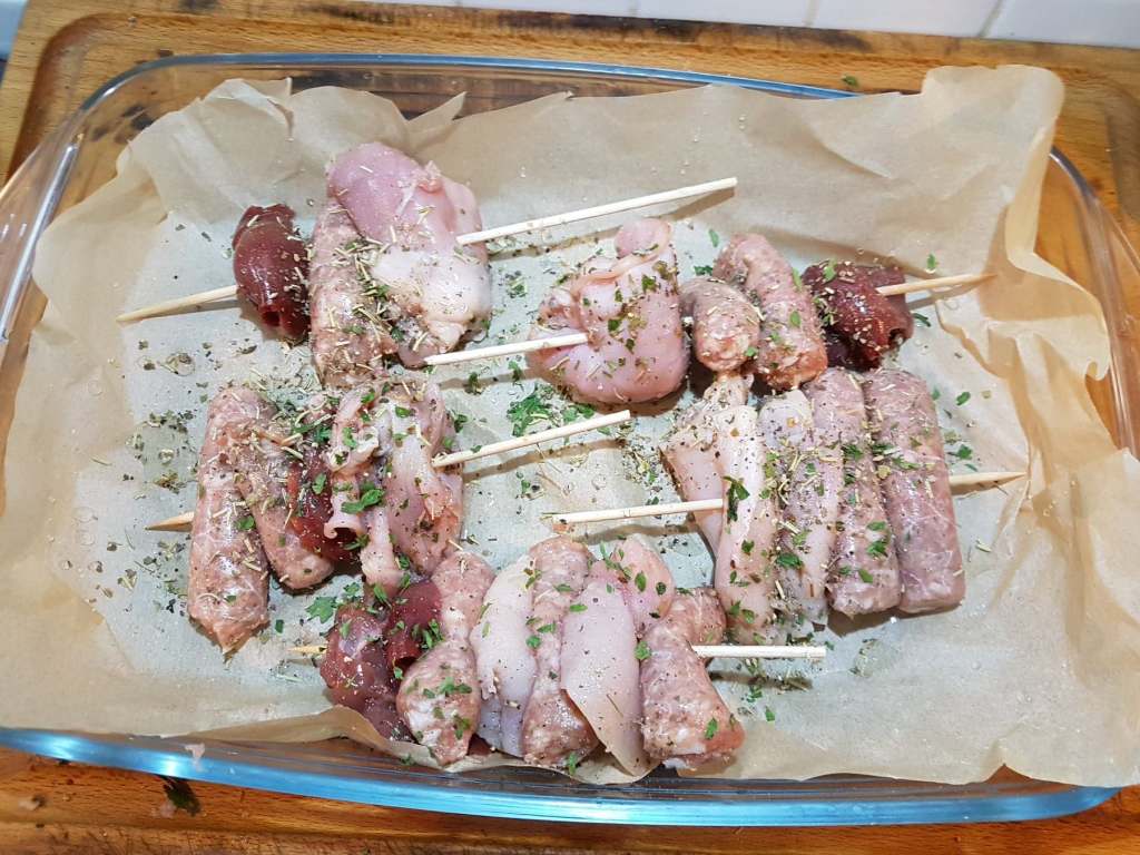 Le reste est d’uns simplicité extrême. Sur chaque brochette, on enfilera un involtino de lapin, un morceau de saucisse, un de foie… à votre guise, ajoutant encore des aromates, un peu de sel, de poivre moulu et quelques gouttes d’huile extra vierge d’olive. Attention, la viande de lapin, très maigre, peut sécher très vite, surtout si vous avez, comme moi, un four électrique. La cuisson dans ce cas doit durer environ trois quarts d’heure, à 180°. Pendant ce temps, il faudra retourner les brochettes.