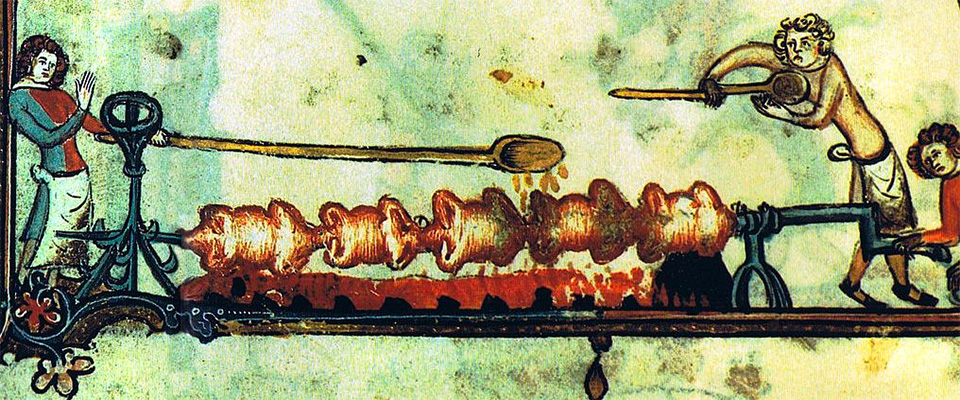 Je vais revenir sur la recette dans un instant, mais j’aimerais rendre hommage à la broche(tte), objet passepartout aux multiples facettes de la cuisine méditerranéenne. Dans la Grèce d’Homère, on l’appelait ὀβελίσκος (obeliskos), diminutif d’ὀβελός (obelos), et on la distinguait de la lance, λόγχη (lónkhē). Les Romains, quant à eux, la désignaient comme venabulum, et elle pouvait être soit une arme de chasse soit un instrument de cuisine.