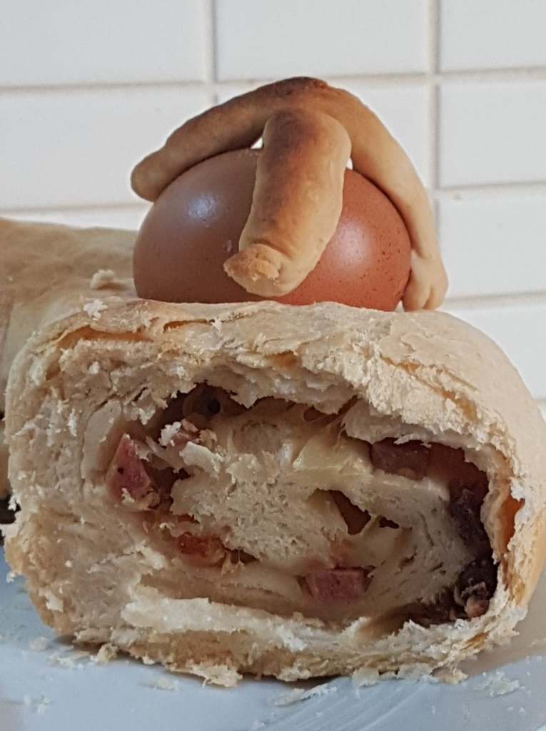 Faites cuire le casatiello au four, à une température de 180°C, pendant 40 minutes. Puis baissez la température à 160°C, et faites cuire encore vingt minutes. Ensuite, attendez qu’il refroidisse et démoulez-le. Il sera encore meilleur après quelques heures de repos. Vous pouvez le savourer, ainsi que les oeufs, comme encas, ou en hors d’oeuvre, pendant deux-trois jours. Il y a même un cousin du casatiello, appelé tortano (parce que reprend la couronne d’épines entrelacée du Christ), avec des oeufs durs à l’intérieur de la pâte).