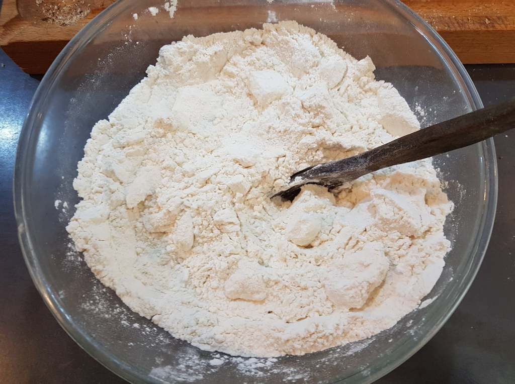 Première chose à faire : mélanger à la main ou avec une cuillère en bois dans un bol, la farine avec le saindoux en morceaux et à température ambiante.