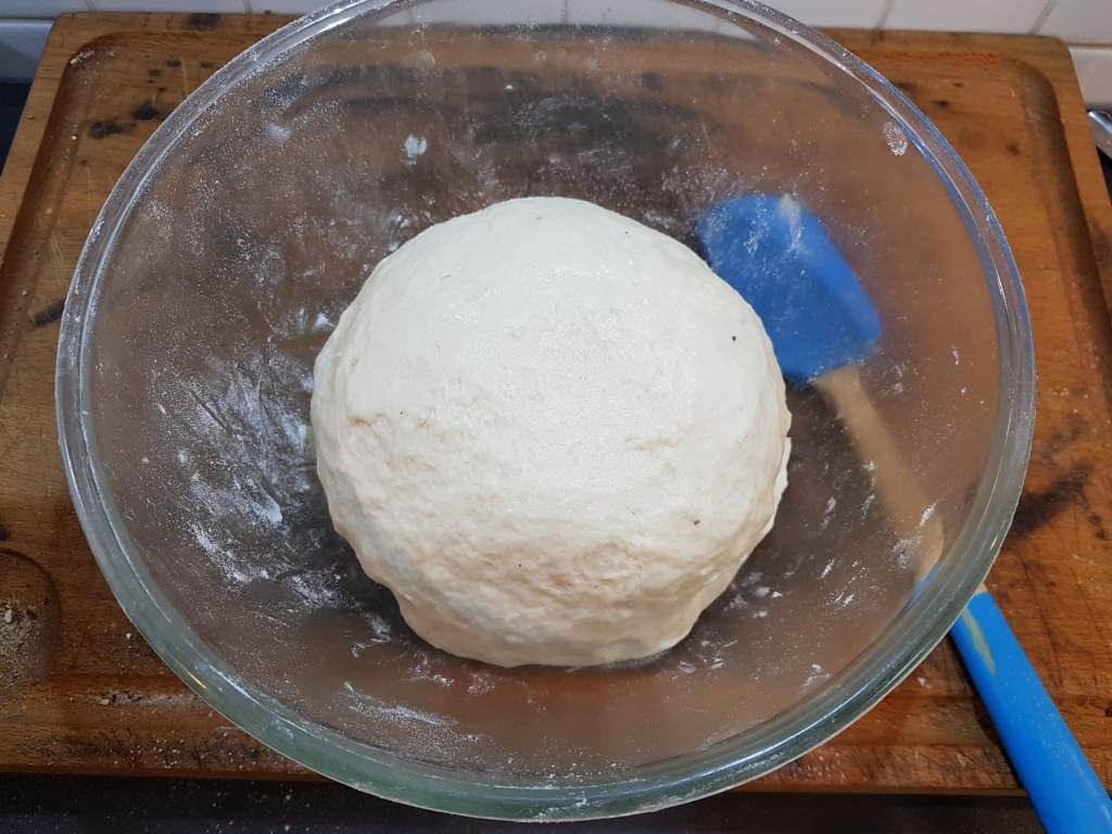 A la fin, prenez la boule de pâte, façonnez-la à la main, et déposez-la dans un bol saupoudré de farine. Couvrez avec un chiffon mouillé et laissez lever dans le four éteint, avec la lumière allumée, au moins douze heures.