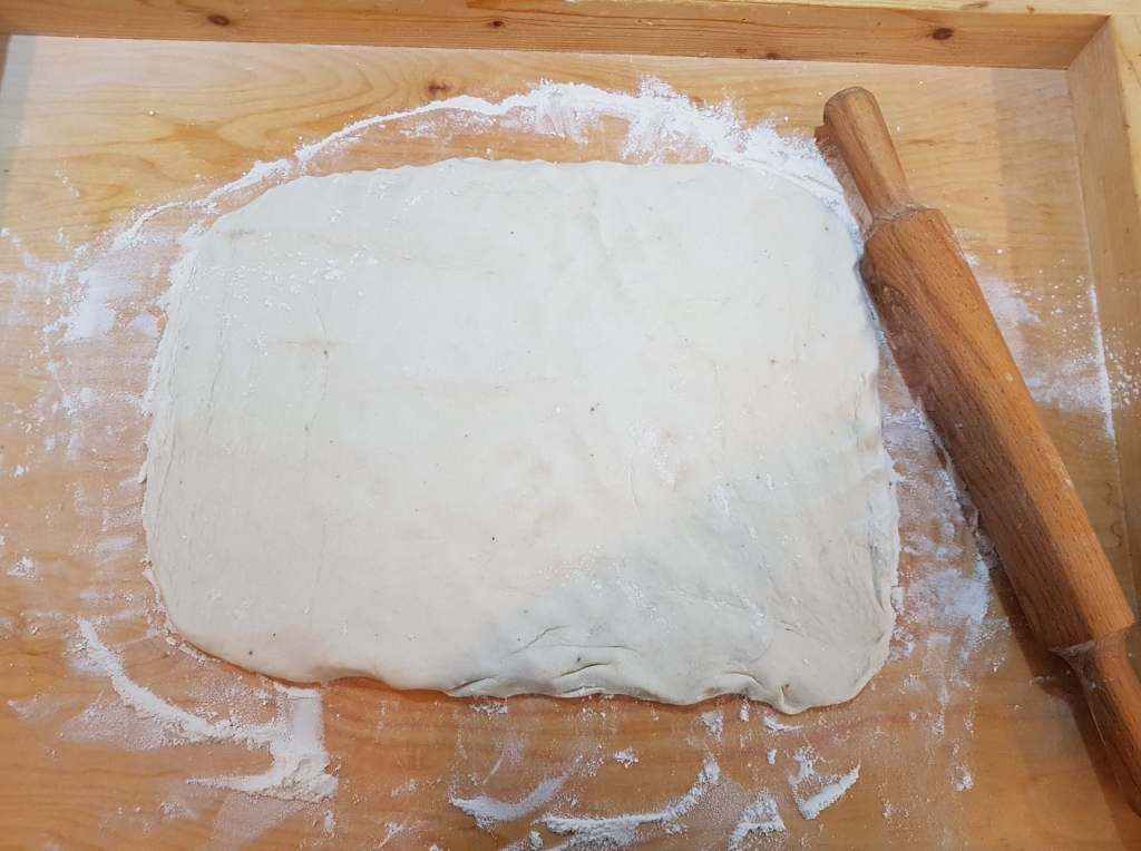 Quant à la pâte : réservez-en environ 30 grammes pour la déco. Etalez le reste jusqu’à atteindre environ un centimètre d’épaisseur sur la planche de travail, à l’aide d’un rouleau à pâtisserie, en forme rectangulaire. Repliez-la trois fois sur elle-même en portefeuille, pour ensuite l’étaler à nouveau. A chaque fois, passez sur la surface un petit pinceau imbibé de saindoux liquéfié, râpez un peu de pecorino et ajoutez du poivre noir moulu.