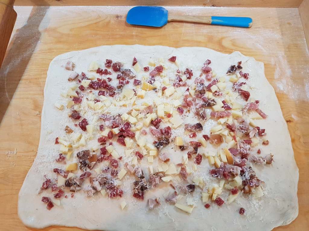 Le jour J : les ingrédients pour la farce. Côté charcuterie, on a du saucisson à couper en fines lamelles ou morceaux, plus des lardons et des ciccioli, résidu grillés du tissu adipeux interne du porc (comme les fritons, ou gratons utilisés en France). Côté fromages, on a du pecorino (romain ou sicilien, légèrement pimenté), du provolone (salé), et de la scamorza (douce et pas fumée), tous en petits morceaux.