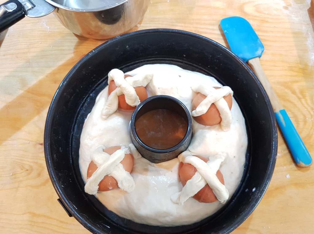 Pour la décoration, déposez quatre oeufs sur la pâte. Prenez la pâte que vous aviez mise de côté. Etalez-la, découpez plusieurs bandelettes et formez des petits ‘rubans’ qui serviront à dessiner les croix au-dessus des oeufs (c’est Pâques, ne l’oubliez pas !). Le tout sera encore imbibé de saindoux à l’aide du pinceau (sinon vous pouvez utiliser un jaune d’oeuf).