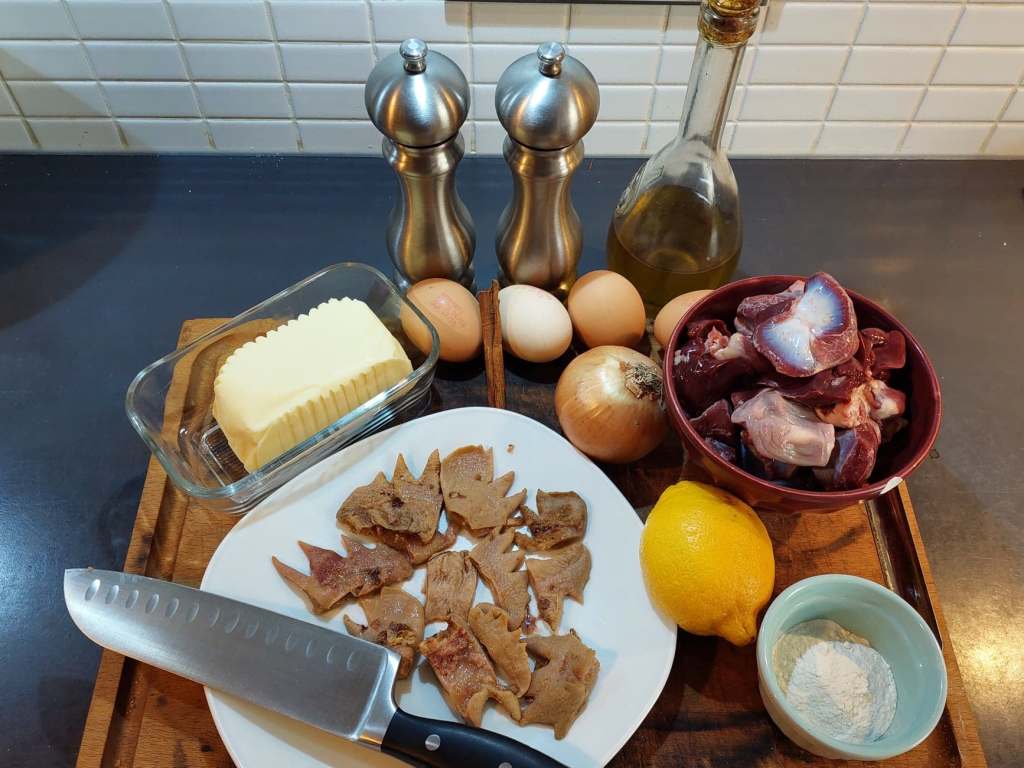 600 g. d’abats de coq (crêtes, foie, cœurs, poumons, gésiers, testicules), 1/2 de bouillon – pattes et cou du coq, plus une carotte et un oignon – ou un cube alimentaire de bouillon de volaille; la pointe d’une cuillère à café de cannelle, un oignon jaune, une cuillère de farine, le jus d’un citron pressé, 4 jaunes d’œufs, sel, poivre, huile extra vierge d’olive, 70 g. de beurre, quelques feuilles de sauge.
