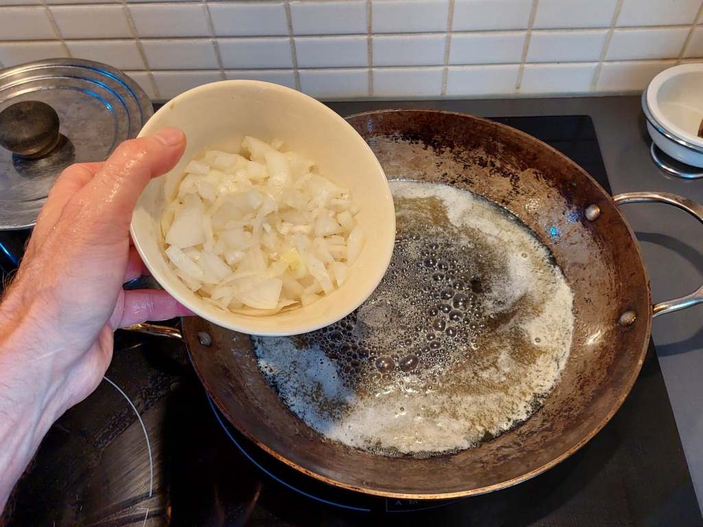 Ajoutez au beurre l’oignon émincé et quelques gouttes d’huile extra vierge d’olive (pour baisser le point de fumée et donner ainsi le temps à l’oignon de bien dorer).