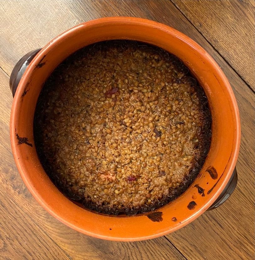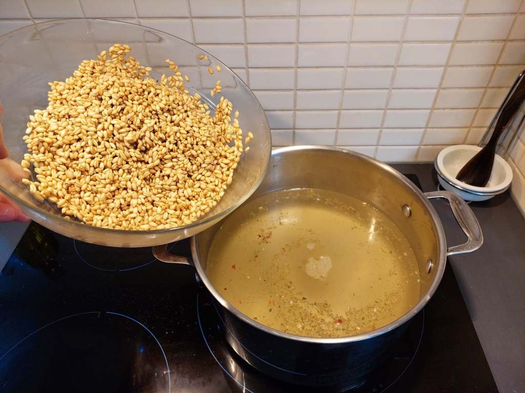 Puis j’ai fait bouillir le blé pendant cinq heures, à feu doux, dans un bouillon végétal.