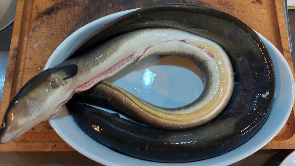 ..et l’anguille en gros morceaux, avec arrête, peau et tête. Ne vous inquiétez pas pour l’odeur : elle sera un peu forte mais agréable.