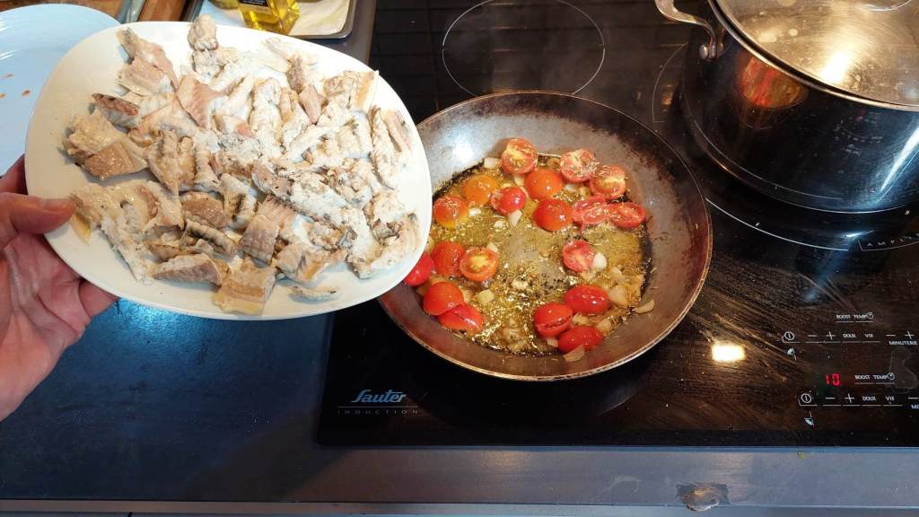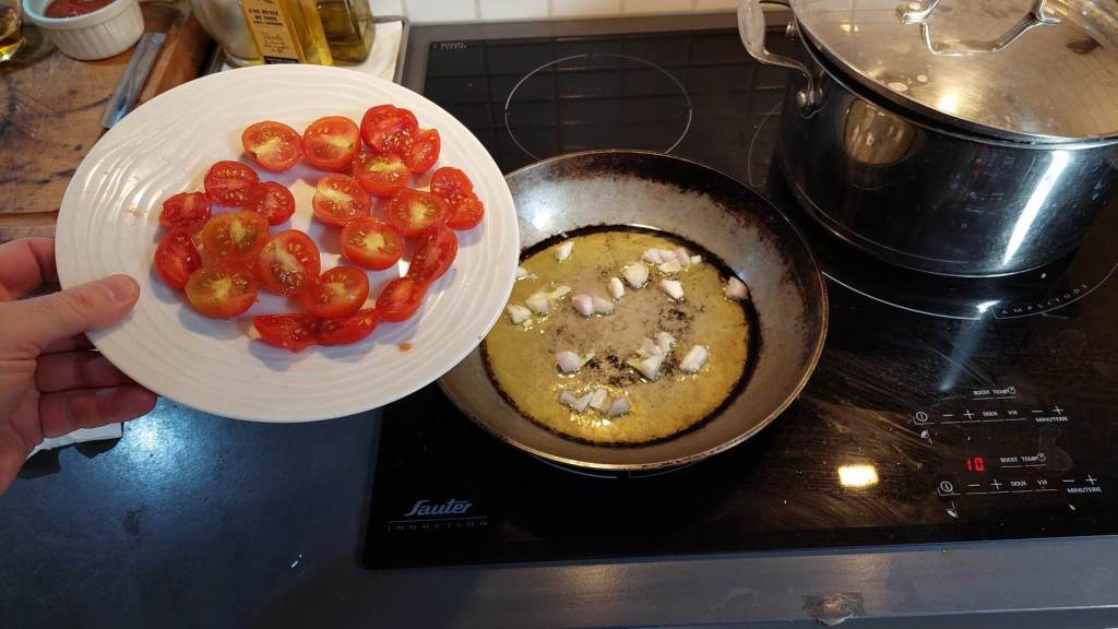 Et c’est parti. Mettez l’huile à chauffer dans la poêle, puis ajoutez les échalotes. Faites-les dorez, ensuite ajoutez les tomates…