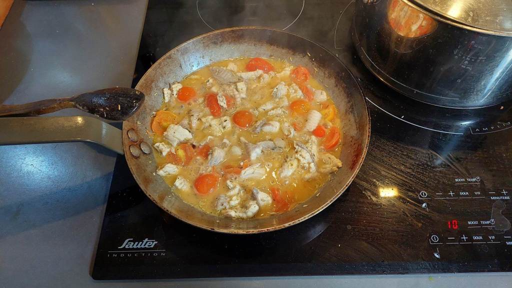 …l’anguille, le vin blanc, et le cognac. Laissez évaporer, ajoutez sel et poivre moulu, touillez doucement et laissez rétrécir (pas trop) la sauce.