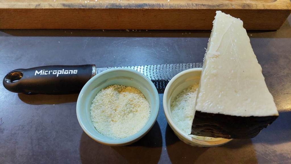 Préparez ensuite les ingrédients surprise : d’abord du fromage pecorino romano (minimum huit mois d’affinage) et du grana padano (à ne pas confondre avec le parmesan), les deux doivent être râpés…