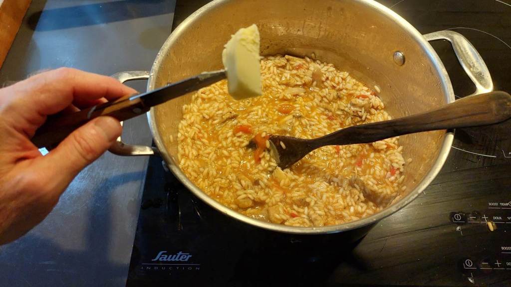 Une fois la cuisson terminée, éteignez le feu, déplacez la casserole, ajoutez un morceau de beurre pour bien lier l’ensemble…