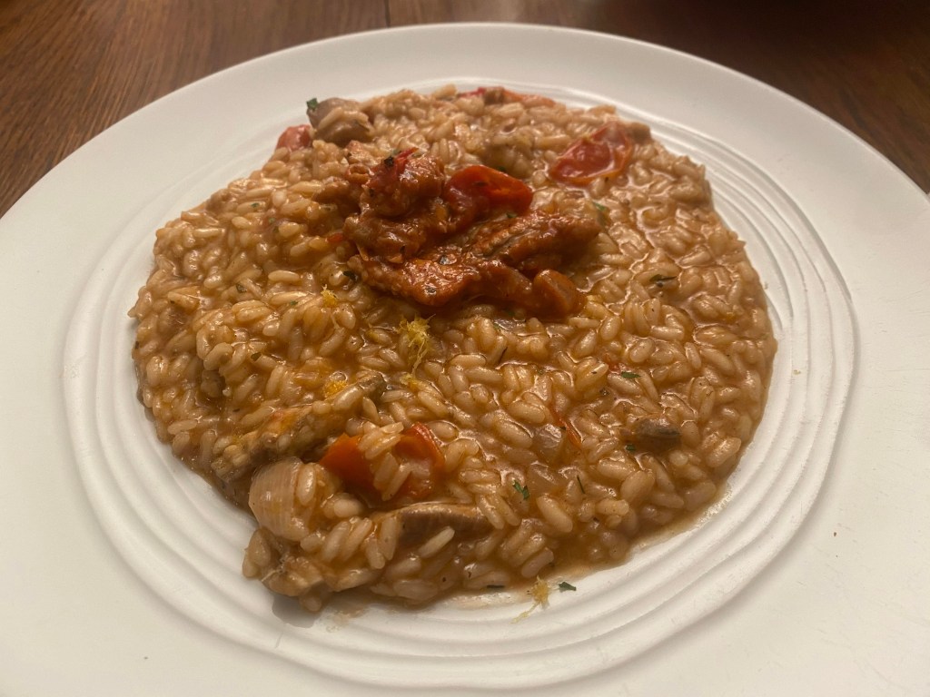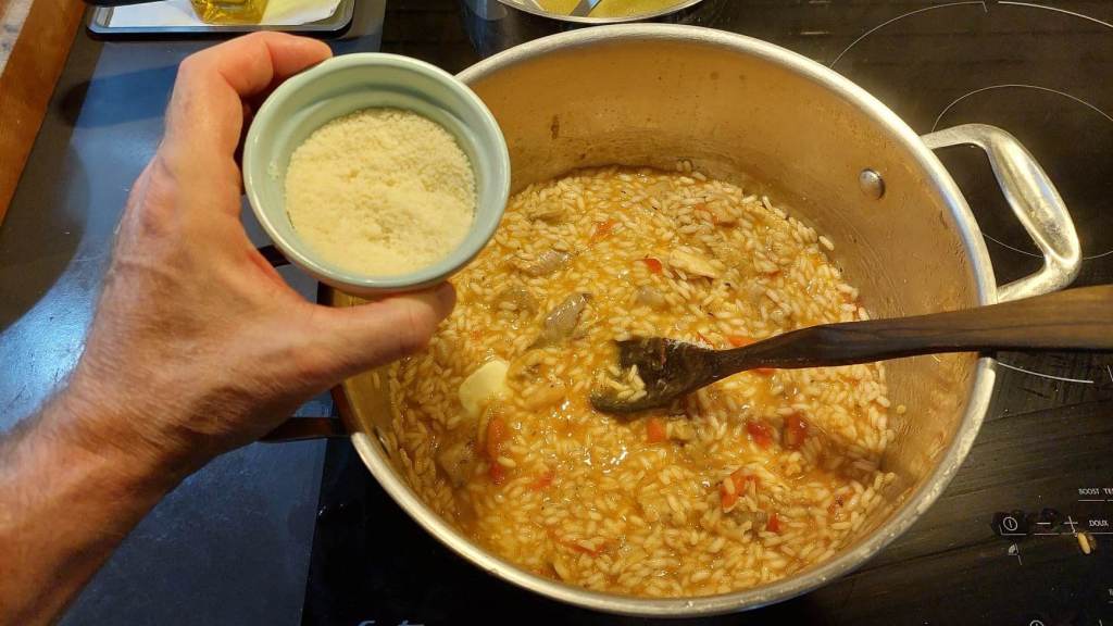 Le reste c’est facile. Dans une casserole faites chauffer un morceau de beurre doux, puis ajoutez un peu d’oignon émincé. Versez le riz, touillez quelques minutes, le temps de le faire torréfier, puis ajoutez un verre de vin blanc, laissez évaporer……et commencez à verser le bouillon, louche après louche, tout en touillant délicatement.
