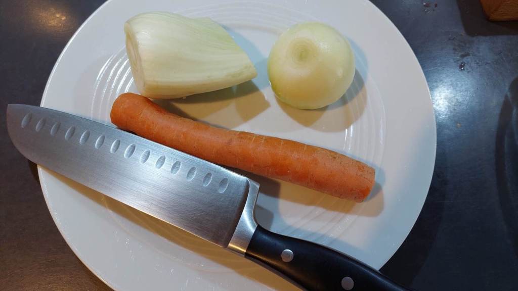 Pour le bouillon donc on coupe en morceaux les légumes émincés, on ajoute des aromates (feuilles de laurier, thym)…