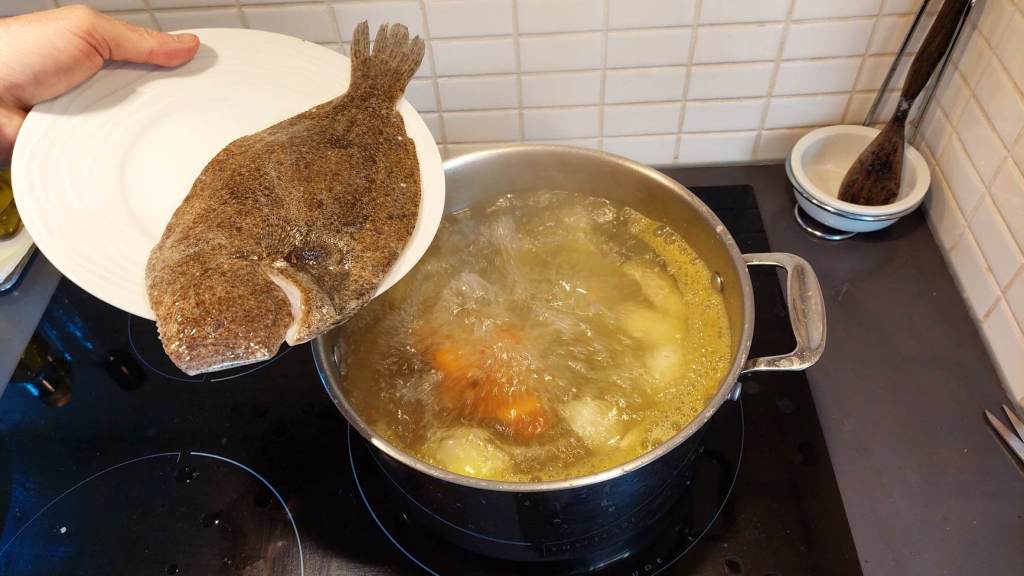 Mais tout d’abord il faut expliquer la préparation du bouillon qui servira pour la cuisson du risotto. Dans l’absolu, il faudrait avoir à disposition plusieurs poissons de lagune qui sur place ne coûtent pas cher – une petite anguille, un turbot, des rougets, une limande ou une sole, un mulet doré, et même un bar…- qu’il faut vider, couper en morceaux et laisser mijoter avec une carotte, une branche de céleri (ou un fenouil) et un oignon dans plusieurs litres d’eau, pendant au moins trois heures, jusqu’à que le bouillon soit réduit d’un tiers. Mais en ville les prix s’envolent vite, et pour ne pas excéder, j’ai utilisé seulement une anguille et une limande (plus les légumes et cinq litres d’eau).