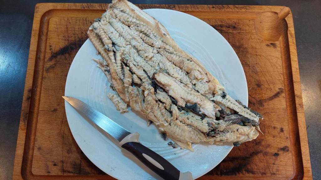 Revenons aux anguilles. Elles sont recouvertes d’une muqueuse très gluante qui leur permet de se mouvoir en dehors de l’eau. Pratique pour elles, un cauchemar pour qui doit les cuisiner ! Alors j’ai procédé de la sorte : j’ai gratté les deux anguilles avec du sopalin et du gros sel avant d’essayer d’enlever la peau avec un couteau…mais n’ayant pas le coup de main, ni une planche en bois au-dessus de laquelle clouer la tête (et oui, c’est ça la technique) j’ai procédé avec le plan B en les ébouillantant pendant une minute.
