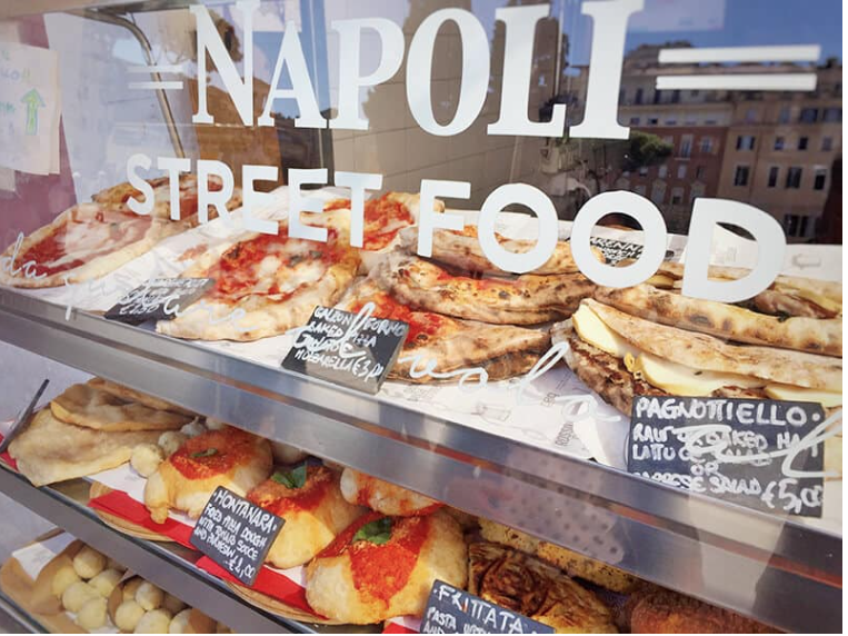 Troisième élément, la capacité des commerçants napolitains à s’adapter au marché, sans oublier leurs traditions ancestrales. Si vous avez donc un petit creux, vous pourrez choisir pour trois fois rien entre : la pizza au four (à bois) dans toutes ses variantes ; la pizza frite à l’huile de sésame, avec des ciccioli (copeaux de gras de porc), de la provola (fromage à pâte filée produit avec du lait de vache) et poivre ; le calzone (chausson), sorte de pizza repliée sur elle-même et cuite au four, remplie de ricotta et ciccioli mélangés à de la cannelle, des clous de girofle, du laurier, du poivre et de la noix de muscade ; le cuoppo fritto (morceau frit), sorte de crêpe salée à base de pâte à pizza (qui a levé) ; les sciurilli (crêpes avec les fleurs de courgettes) ; les scagliuozz’ (des triangles de polenta frite), ‘e pall’e rise (les boules de riz), variante des arancini siciliens ; ‘a frittata‘e maccheroni (en fait, pas une omelette mais un timballo de pâtes).