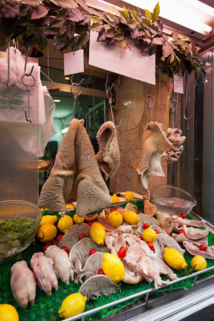 Pour les nostalgiques, il y a encore un ou deux endroits où l’on propose du bror’e purp, le bouillon de poulpe, très nourrissant, jadis composé d’eau de mer, poivrons pimentés et quelques tentacules – les ranfetelle – de la bestiole. Pour les palais exigeants, il y a aussi toutes sortes d’abats. La tradition veut que les nobles de l’époque des Bourbon – qui parlaient français à la cour – lançaient des balcons les restes des « entrailles » pour satisfaire le peuple affamé, et que les gens couraient en criant les « zendraglie ! », terme resté en usage encore de nos jours. On a donc les tripes classiques, ou sinon une soupe de sauce tomate et morceaux d’abats, et surtout le fameux per ‘e ‘o muss, littéralement pied et museau, en réalité cartilages et pis de vache, ou encore tétine et utérus de truie. Le tout cuit longuement dans l’eau salée et puis assaisonné avec pas mal de citron, des graines de lupin, olives et piment…