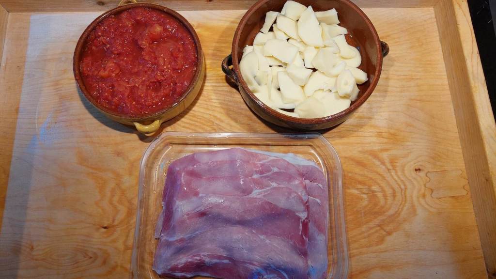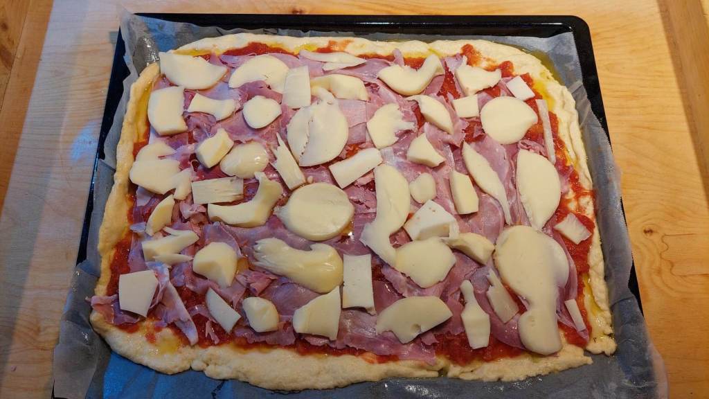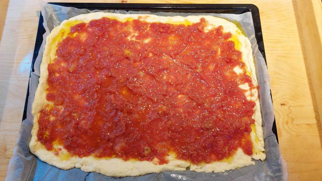 300 g. de farine blanche pâtissière T45, 200 g. de farine Manitoba, 6 g. de levure fraiche de boulanger, 310 g. d’eau, 10 g. de sel fin, 5 g. de sucre, 30 g. d’huile extra vierge d’olive, trois boîtes de tomates pelées italiennes de 400 g. chacune, 300 g. de fromage (au choix entre scamorza, etc.), 150 g. de jambon cuit en tranches, 1 rouleau de pâte feuilletée (de 230 g.), le jaune d’un œuf.