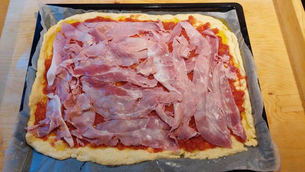 Etape deux : répartissez le jambon cuit sur la sauce tomate.