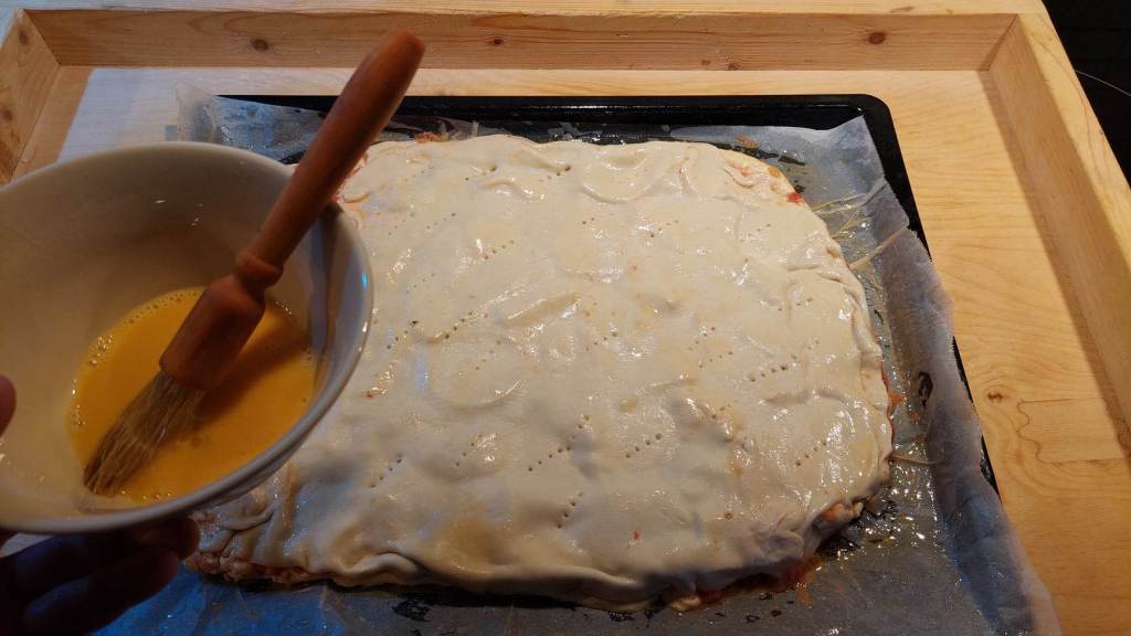 Etape quatre : la pâte feuilletée (achetée déjà prête). Il faut l’agrandir à l’aide d’un rouleau à pâtisserie, puis l’étaler avec les mains sur toute la surface de la pizza (à nouveau, attention à ne pas la déchirer), en scellant les bords. Ensuite, il faudra utiliser les dents d’une fourchette pour la trouer à plusieurs endroits. A l’aide d’un pinceau, badigeonnez l’ensemble du jaune d’un œuf (si vous voulez, mélangez-le avec de la crème fleurette).