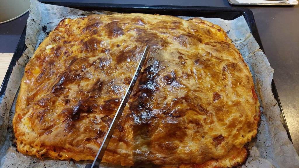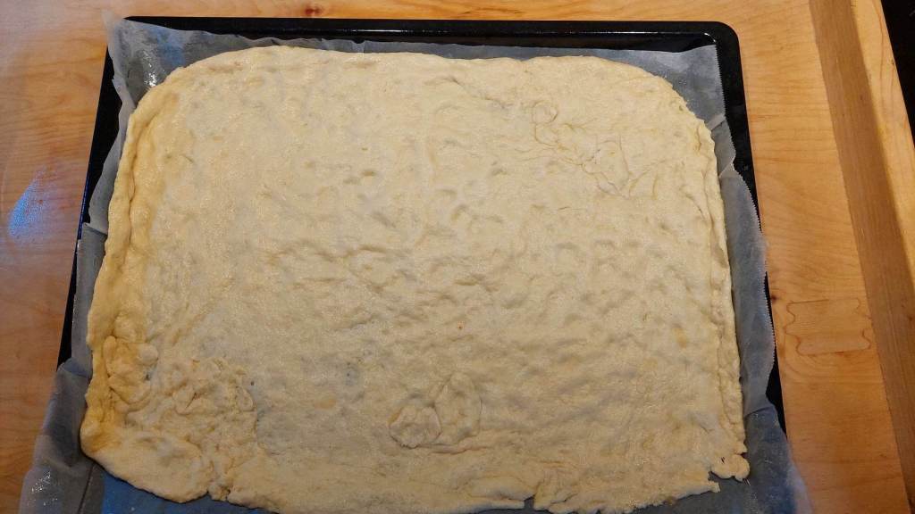 Revenons à la pâte. Normalement ella a triplé son volume. Il est temps de l’étaler sur la lèchefrite du four, huilée (éventuellement recouverte d’une feuille de papier cuisson). Cette délicate opération s’effectue en faisant simplement pression avec vos doigts. Attention à ne pas la déchirer.