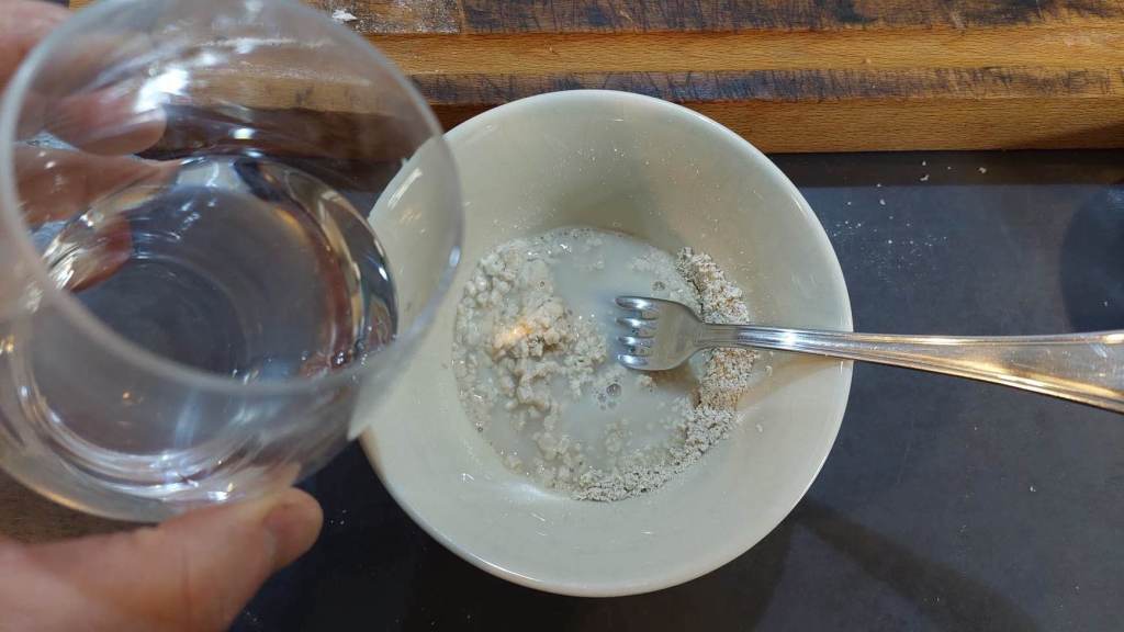 Autre ingrédient indispensable, la levure fraiche de boulanger, à dissoudre dans un bol avec un peu d’eau tiède.