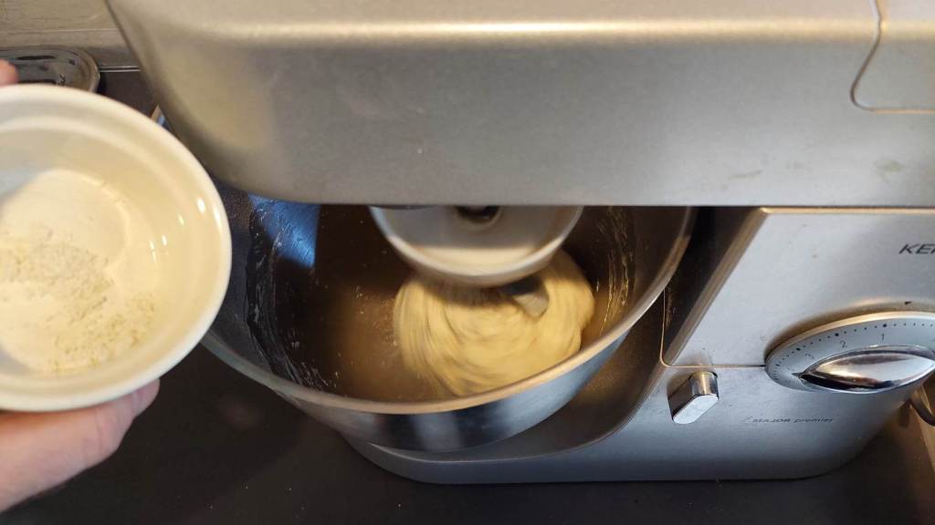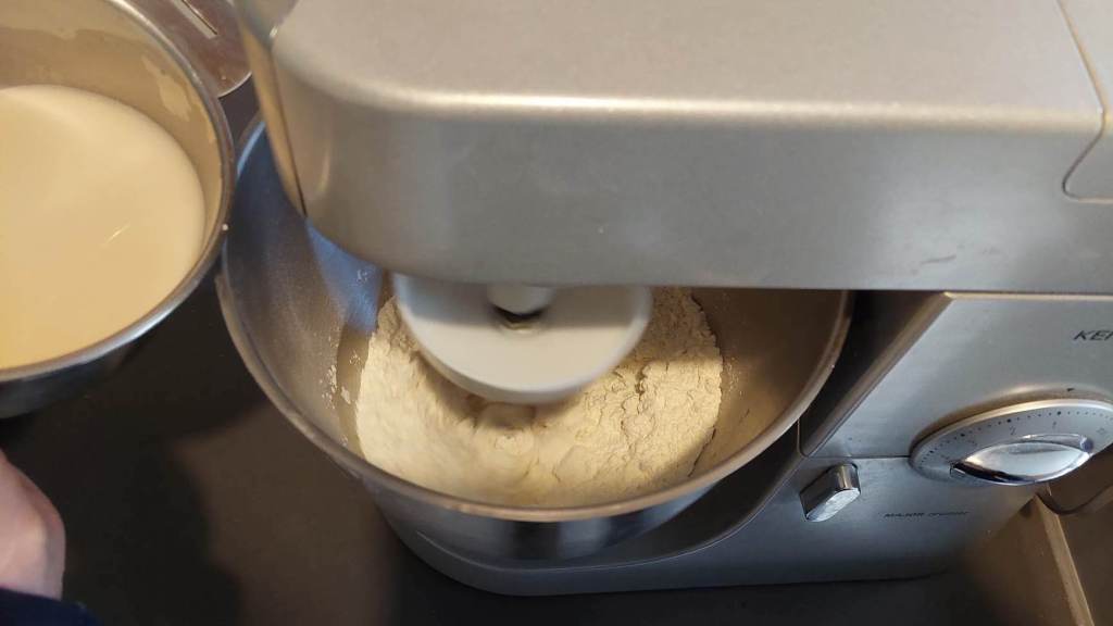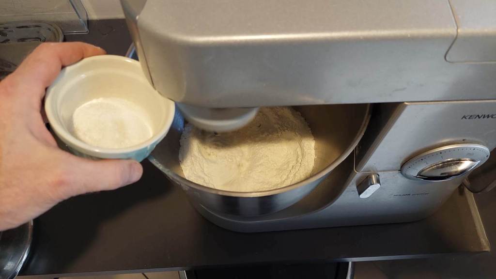 Et c’est parti. Dans un robot pétrisseur, j’ai mélangé les deux farines, en y ajoutant après, dans l’ordre, du sucre…