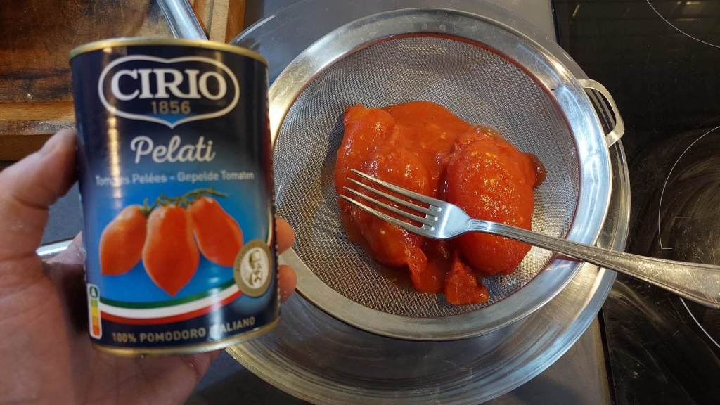 Pendant ce temps-là, vous pourrez vous occuper de la sauce. Il faut égoutter les tomates en boîte, les écraser à l’aide d’une fourchette et les couper en petits morceaux (avec des ciseaux). Cela vous permettra d’avoir une sauce bien dense.