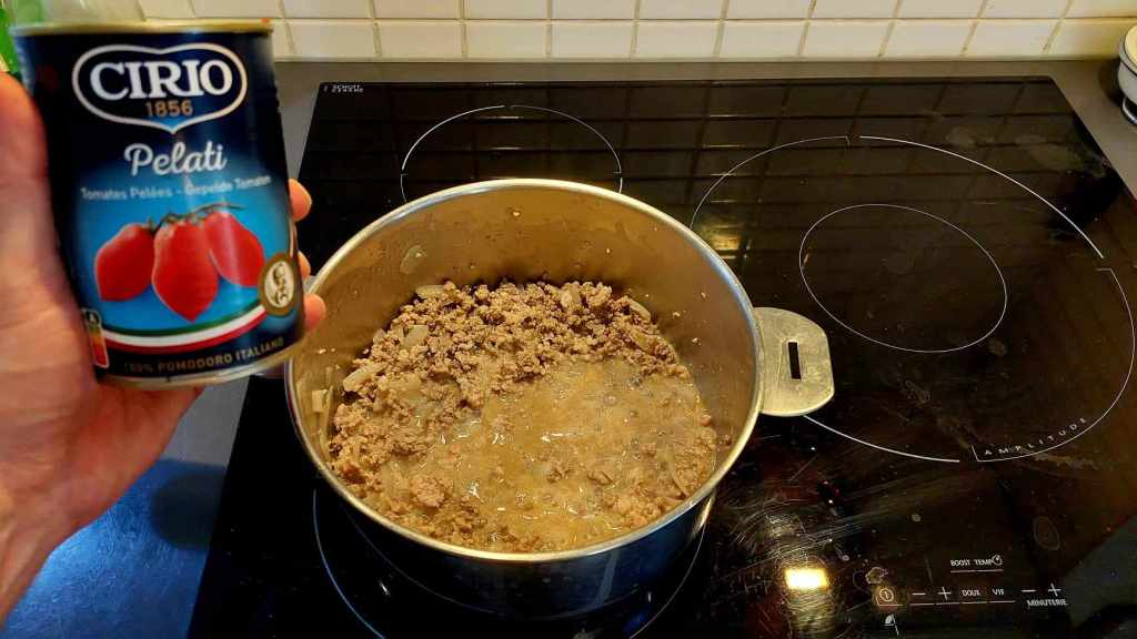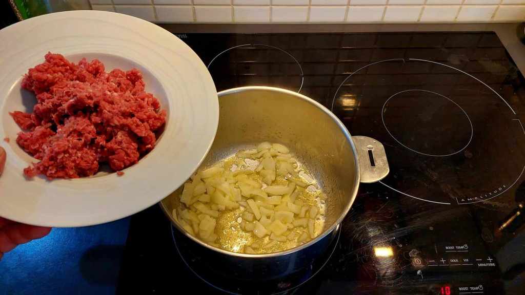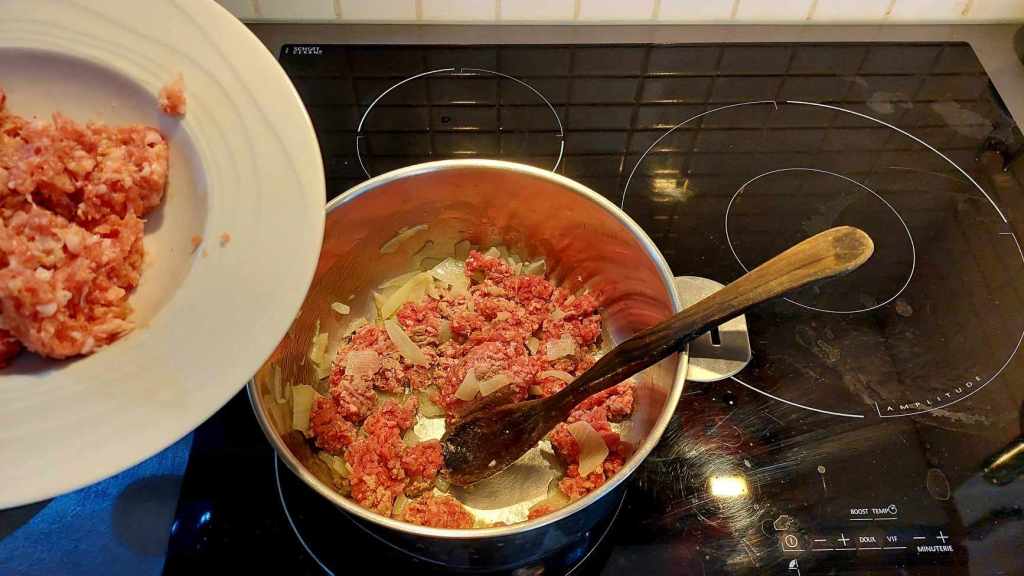 D’abord, la sauce, « à la bolognaise » ou presque. Dans une casserole, faites dorer un oignon émincé avec de l’huile extra vierge d’olive. Puis, ajoutez la chair à saucisse finement hachée…