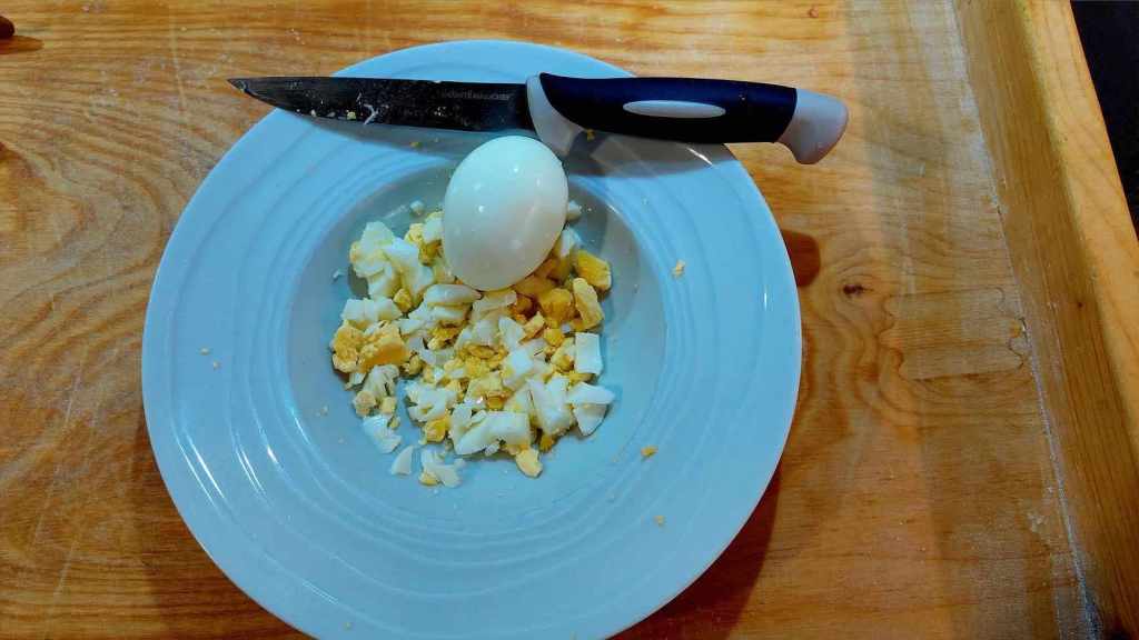 Pendant que la sauce mijote, vous aurez largement de quoi faire. Préparez donc des oeufs durs (dix minutes de cuisson), puis coupez-les en petits morceaux à l’aide d’un couteau.