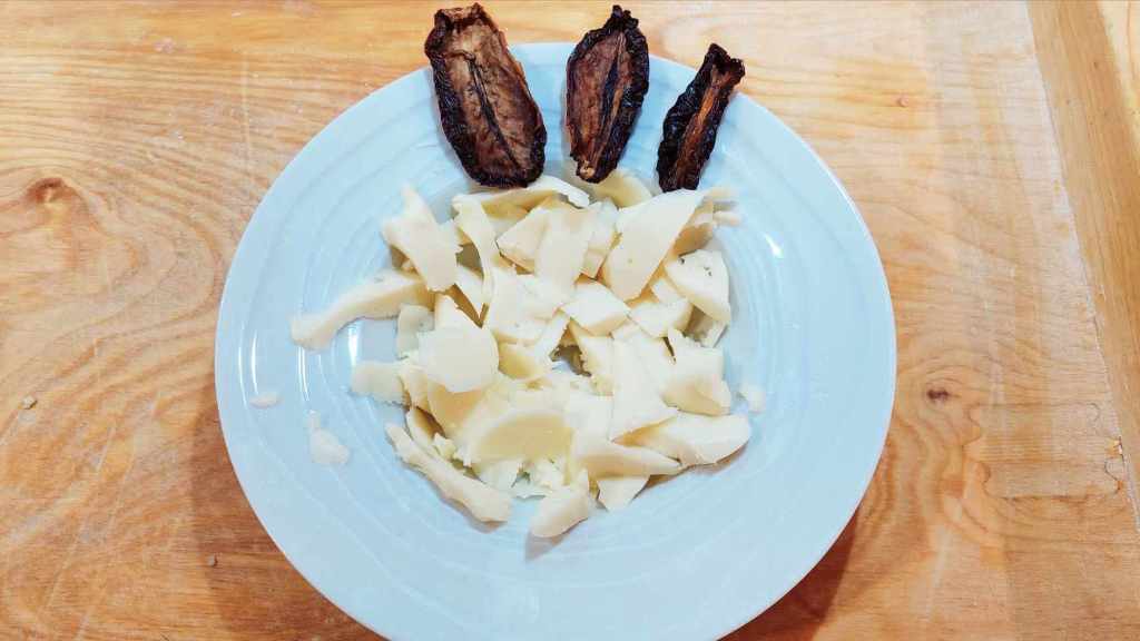 Et ce n’est pas fini. Pour rendre le tout plus savoureux, « à la sicilienne », il faut aussi ajouter des tomates séchées (qu’il faudra mouiller dans l’eau tiède avant utilisation), et le caciocavallo, effiloché pour mieux l’étaler sur le plat.