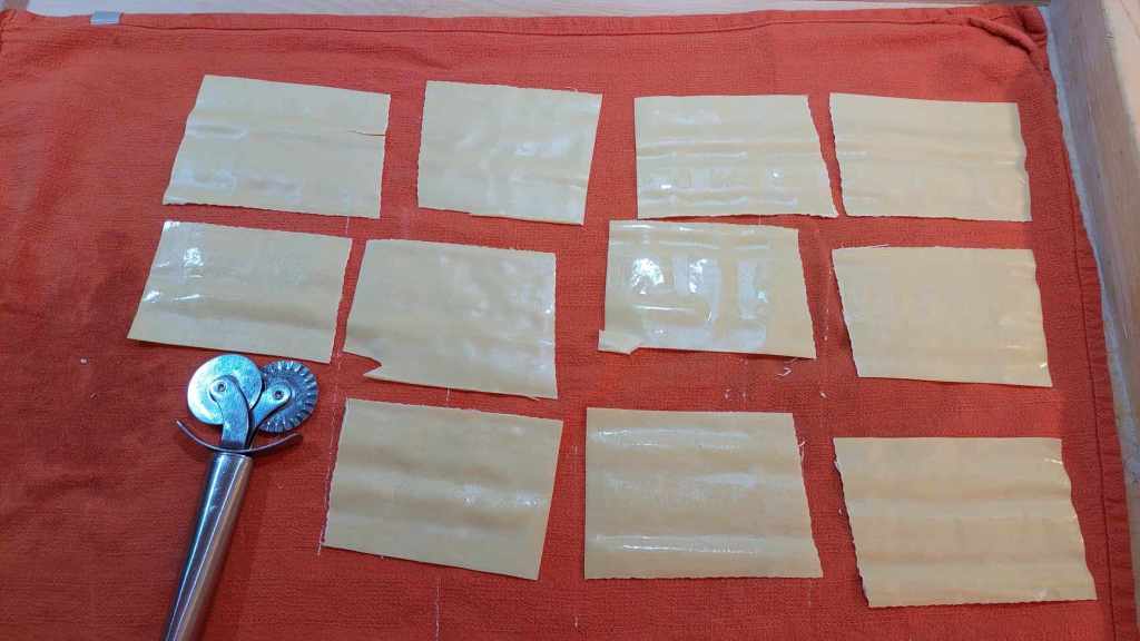 Mais revenons à nos cannelloni. Si vous utilisez des pâtes sèches, il vous faudra tout de même les faire bouillir, pour ensuite les égoutter très al dente, les verser dans de l’eau glacée et finalement les poser délicatement sur un plan de travail pour les sécher. Si en revanche vous optez pour les pâtes fraîches, soit vous les faites vous-mêmes, soit comme moi vous utilisez les feuilles déjà prêtes. Mais là aussi, il faudra intervenir.