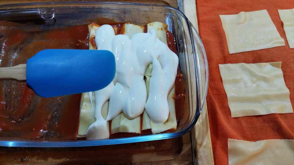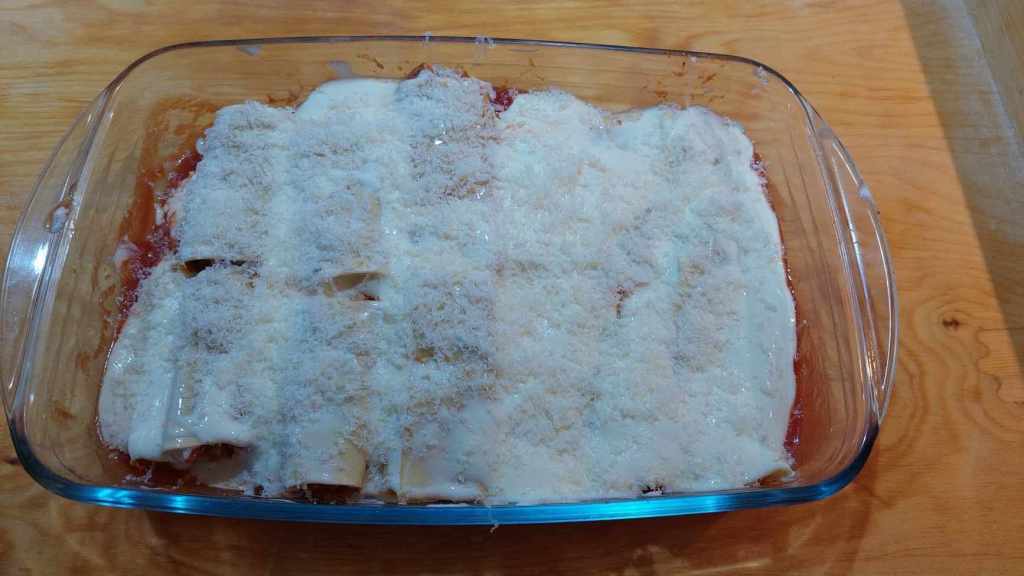 Prenez un plat à four, versez-y l’huile et de la sauce tomate, pous une première rangée de cannelloni. Couvrez avec la béchamel et un partie du caciocavallo.
