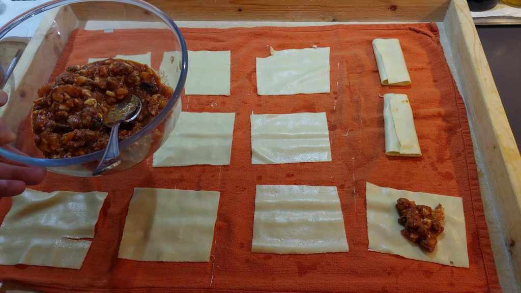 …pour enfin les égoutter et les déposer, sans les faire se chevaucher, sur des torchons et les laisser refroidir. Le moment venu, on répartira la farce (avec l’ajoute de tomates séchée émincées) sur les rectangles de pâte, avant de les rouler sur eux-mêmes, en commençant par le petit côté, pour former des cannelloni.