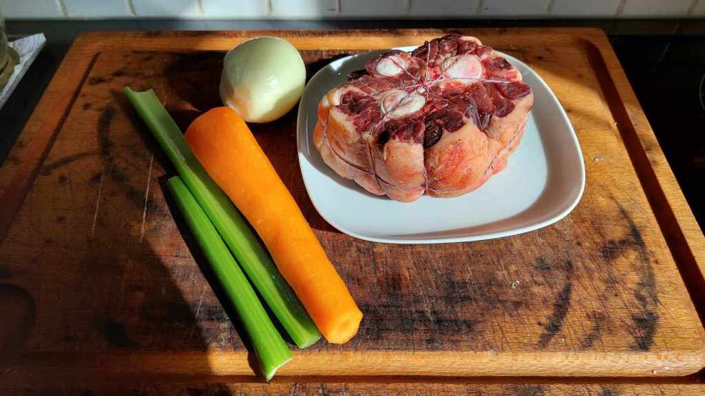 Mais encore faut-il y parvenir ! Passons donc aux fourneaux. D’abord le bouillon. Pour le préparer, on a besoin d’un oignon, d’une carotte, de quelques branches de céleri, et de la queue de bœuf.