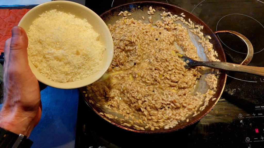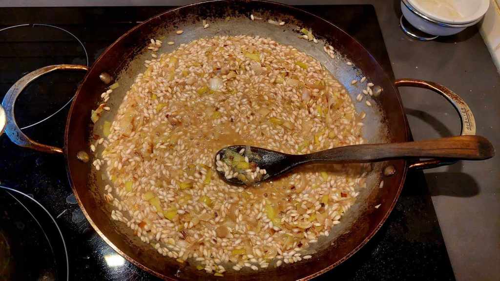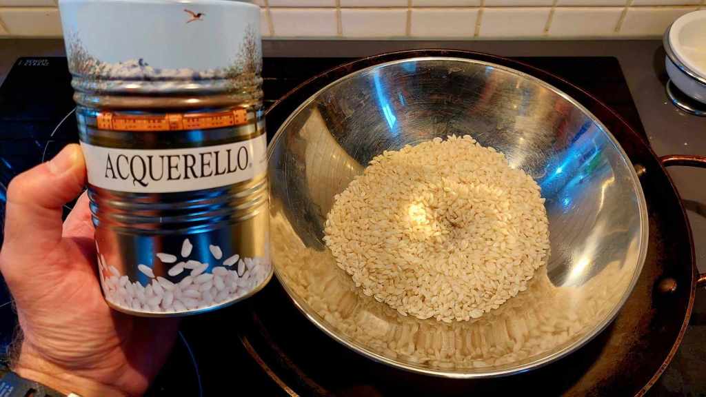 Entre temps, on s’intéressera à l’invité d’honneur : le riz. Dans la Vénétie, on a des excellentes productions comme le Vialone Nano de Verone, ou le riz du Delta del Po. Moi j’ai pu mettre la main sur un autre fleuron de l’agriculture italienne, une variété carnaroli de Vercelli (dans le Piémont), affinée plus d’un an (déjà utilisé dans une autre recette, donc une valeur sûre).
